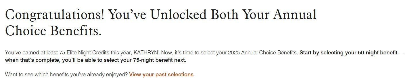 Marriott elite status offers some impressive benefits to frequent travelers. But the perks get particularly compelling once you accrue at least 50 elite nights in a calendar year. At this point, you’ll unlock Marriott Platinum Elite status, but you’ll also get the ability to pick a Marriott Annual Choice Benefit.You can select one Marriott Annual Choice Benefit when you reach 50 elite nights in a calendar year and another when you get to 75 elite nights.If you accrued at least 50 elite nights with Marriott Bonvoy during 2025, the deadline for selecting your Choice Benefit is Feb. 1. So, here’s what you should know about selecting Marriott Annual Choice Benefits, including the available options and how to make the best choice for your upcoming travel.Marriott Annual Choice Benefit overviewYou earn a Marriott Annual Choice Benefit when you accrue 50 elite nights in a calendar year. Then, you’ll earn a second Annual Choice Benefit after reaching 75 elite nights in a calendar year. However, the Choice Benefits options differ between the two tiers.How to select your Marriott Annual Choice BenefitTo select your Annual Choice Benefit(s), visit this page on Marriott’s website. You must sign in to your Marriott Bonvoy account to choose your benefit.MARRIOTTYou can’t change your selection once you make it, so choose wisely. If you’re eligible for a 50-night and a 75-night benefit, you must select your 50-night benefit before you can select your 75-night benefit.Related: Best Marriott hotels in the world that you can book with pointsWhen to select your Marriott Annual Choice BenefitIf you accrued 50 or 75 elite nights in 2025, you must select your Annual Choice Benefit(s) by 11:59 p.m. EST on Feb. 1. If you don’t make your selection(s) by the deadline, Marriott will automatically choose Nightly Upgrade Awards for you.How to earn Marriott Bonvoy elite nightsEarning 50 or 75 elite nights in a calendar year may sound daunting. However, Marriott provides multiple ways to earn elite nights. You’ll earn elite nights at participating Marriott brands when you book directly with Marriott — even when redeeming Marriott points or using a free night award certificate.The St. Regis Hong Kong. ERIC ROSEN/THE POINTS GUYYou can also earn elite night credits with select Marriott Bonvoy credit cards. You can earn up to 25 elite night credits each year with a Marriott consumer card and an additional 15 with a Marriott business card. Some Marriott cards even offer additional elite night credits when you hit specific spending thresholds.Finally, it’s worth noting that you must reach the applicable elite night thresholds to unlock a Choice Benefit. Although the Marriott Bonvoy Brilliant® American Express® Card comes with automatic Platinum Elite status as long as your account remains open, that doesn’t qualify for a benefit selection.However, the Marriott Bonvoy Brilliant card does offer a similar benefit — the Brilliant Earned Choice Award — that cardholders earn after spending $60,000 on eligible purchases with their Bonvoy Brilliant card in a calendar year. Brilliant Earned Choice Awards — which you must select by Feb. 1 of the year following the spending — include a choice of five Nightly Upgrade Awards, a free night award worth up to 85,000 points, 50,000 Marriott Bonvoy points or $1,000 off a bed from any Marriott Bonvoy retail brand. The discount on a bed purchase is only available if you earned your Brilliant Earned Choice Award based on spending in 2025 or before, though.Related: Why you need both a personal and business Marriott Bonvoy credit card50-night Annual Choice Benefit optionsYou’ll unlock your first Marriott Annual Choice Benefit when you accrue 50 elite nights in a calendar year. Your options for the 50-night benefit earned via nights in 2025 are as follows:Five elite night creditsFive Nightly Upgrade Awards$1,000 off a mattress$100 charity donationGift Marriott Silver Elite status to another memberMost of these benefits are difficult to value, so let’s examine each option more closely. I’ll start with the options that are unlikely to make sense for most elite members.Gift Marriott Silver Elite statusGiving status to someone else might initially sound like a good option. However, Marriott Silver Elite status isn’t worth much, as the primary perks are a 10% points bonus on paid stays and priority late checkout.Instead of using your Marriott Choice Benefit to gift status, you could encourage your friend or family member to earn Marriott status via a credit card. For example, primary cardholders of the no-annual-fee Marriott Bonvoy Bold® Credit Card (see rates and fees) get automatic Silver Elite status and five elite night credits each calendar year as a cardholder perk.Give a $100 charity donationYou can select a $100 donation to several charities — including UNICEF, the World Wildlife Fund and the Arne M. Sorenson Hospitality Fund — as your Marriott Annual Choice Benefit.MARRIOTTThe $100 charity donation is a nice touch and could be the right decision if you can’t use any other Annual Choice Benefit options. However, I’d prefer to earn points and miles by donating to a charity of my choice and maintain my ability to select one of the other benefits.Related: How you can donate your points and miles to charityGet $1,000 off a mattressIf you love the mattress at a particular Marriott brand, you can buy a new one for your home. If you’re in the market for a Marriott mattress, you can select a promo code worth $1,000 off the full retail value for mattresses and box springs from select Marriott brands as your Annual Choice Benefit.Moana Surfrider, A Westin Resort & Spa, Waikiki Beach. CLINT HENDERSON/THE POINTS GUYHowever, you can’t combine the one-time $1,000 discount with other offers. Therefore, check whether the promo code offers sufficient value compared to other discounts to justify its selection.Receive 5 elite night creditsChoosing five elite n